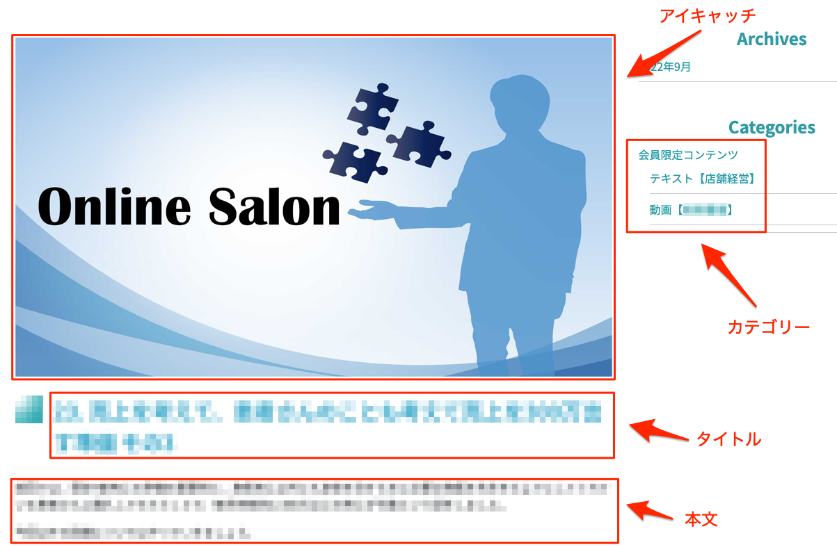 タイトル、本文、カテゴリー、アイキャッチに登録した内容は上図のように表示されます。