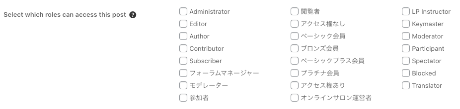 【Restrict access to this post?】にチェックを入れ、【Logged in users】を選択すると下図のようなフォームが開きますので「閲覧可能な」会員種別を選択します。