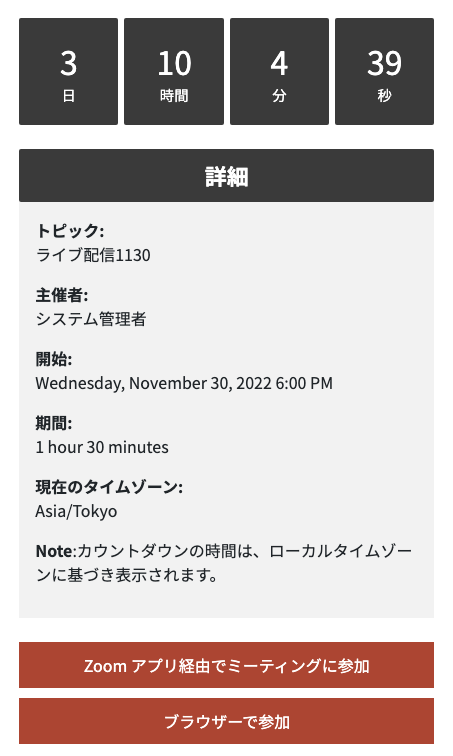 登録されたライブ配信は、会員コンテンツページの右側にリストとして表示され、ライブ名をクリックするとその詳細が開きます。